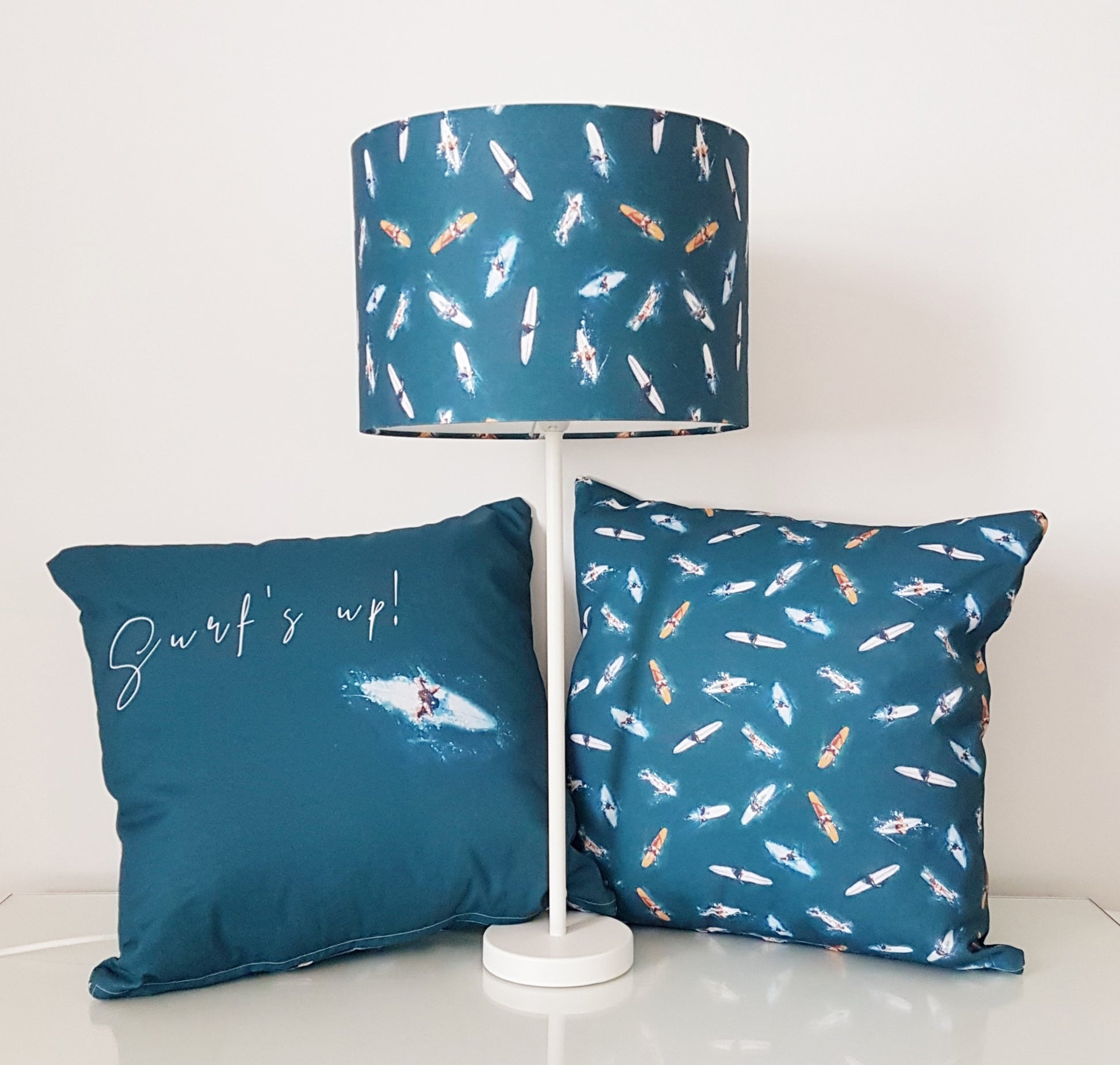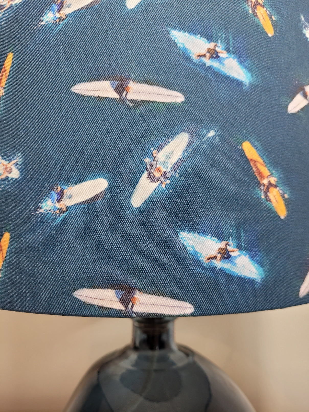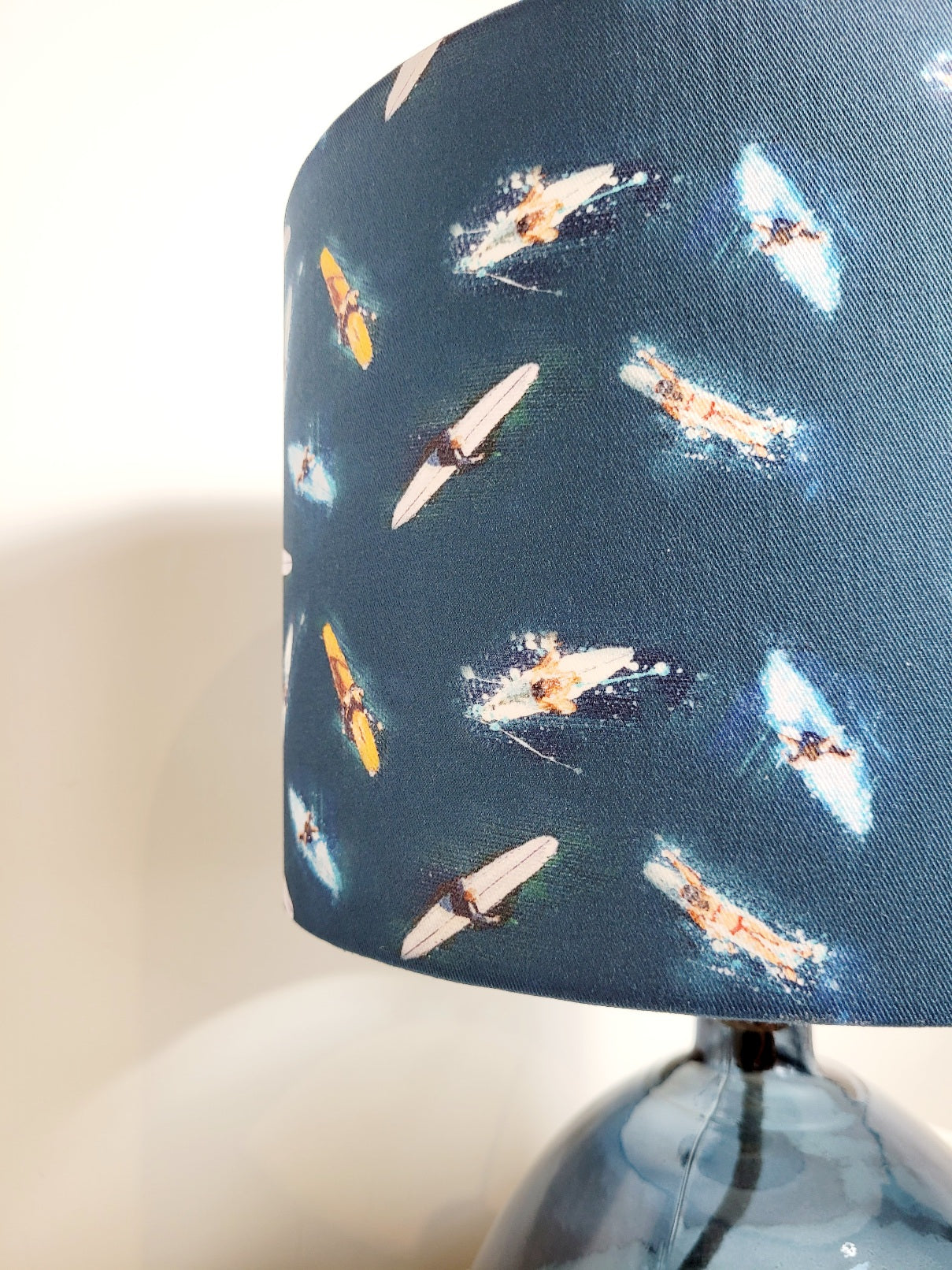 Elevate your home decor with our Aerial Surfer Lampshade. Each hand-made lampshade features a unique aerial surfer fabric design by Jo Allum. Bring a touch of surf-inspired style to any room with this unique piece.