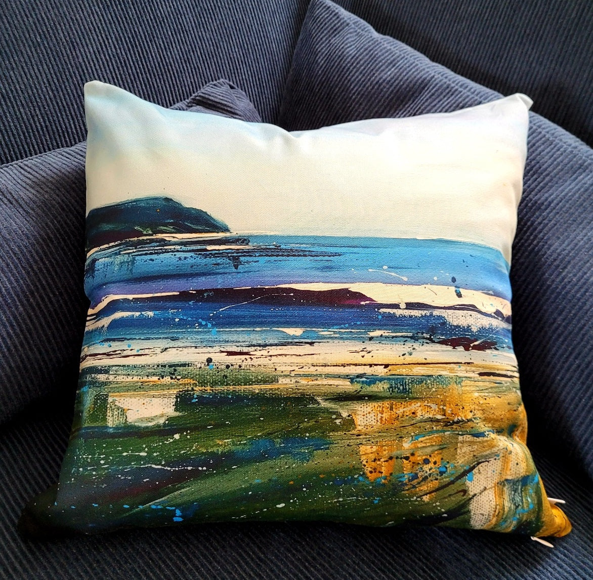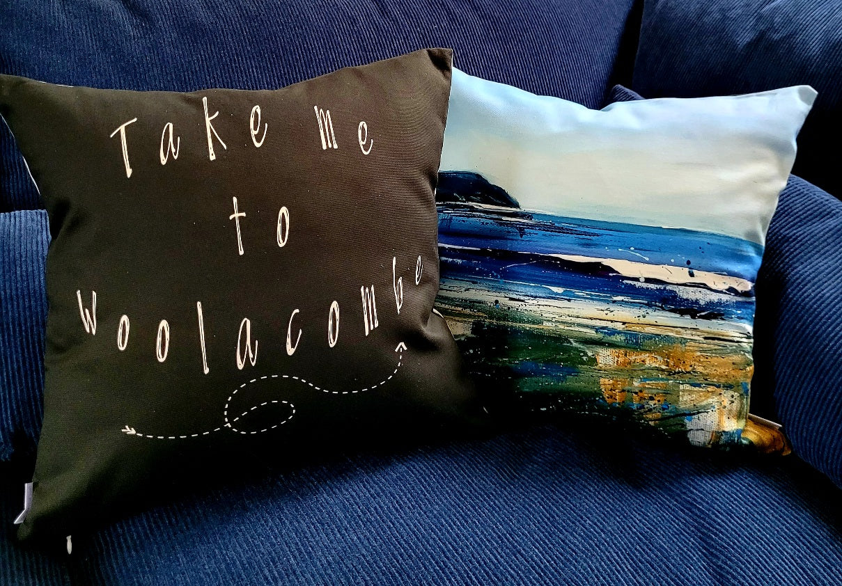 Discover the beauty of Baggy Blues, my 100% Cotton double sided cushion featuring artwork by Jo Allum and "Take me to Woolacombe" text on the dark grey reverse. Enjoy the comfort and style of this unique cushion, perfect for adding a touch of coastal charm to any room.