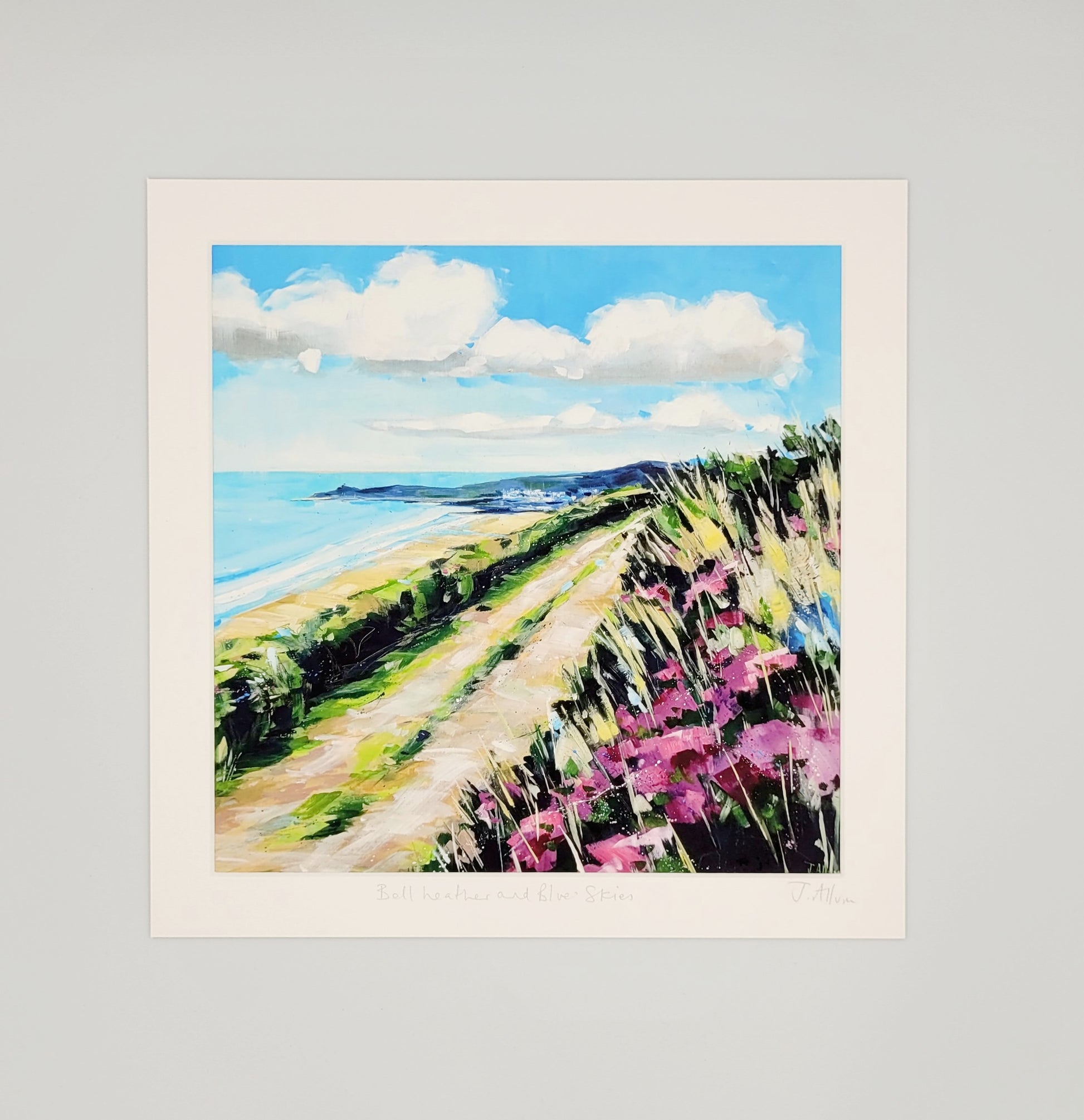 Capture the stunning views of the beach with Bell Heather and Blue Skies art print by Jo Allum.