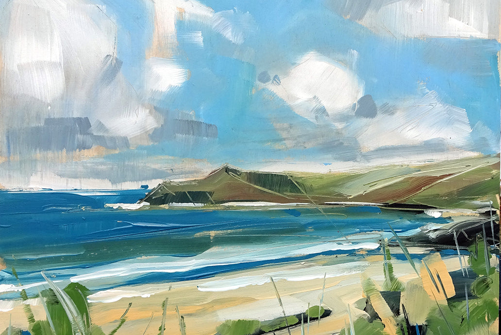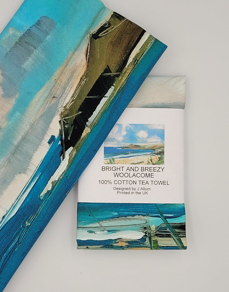 Introducing the Bright and Breezy Woolacombe Tea Towel - a high-quality 100% cotton tea towel featuring stunning artwork by Jo Allum capturing the beautiful views of Woolacombe. Add a touch of charm and functionality to your kitchen with this essential tea towel.