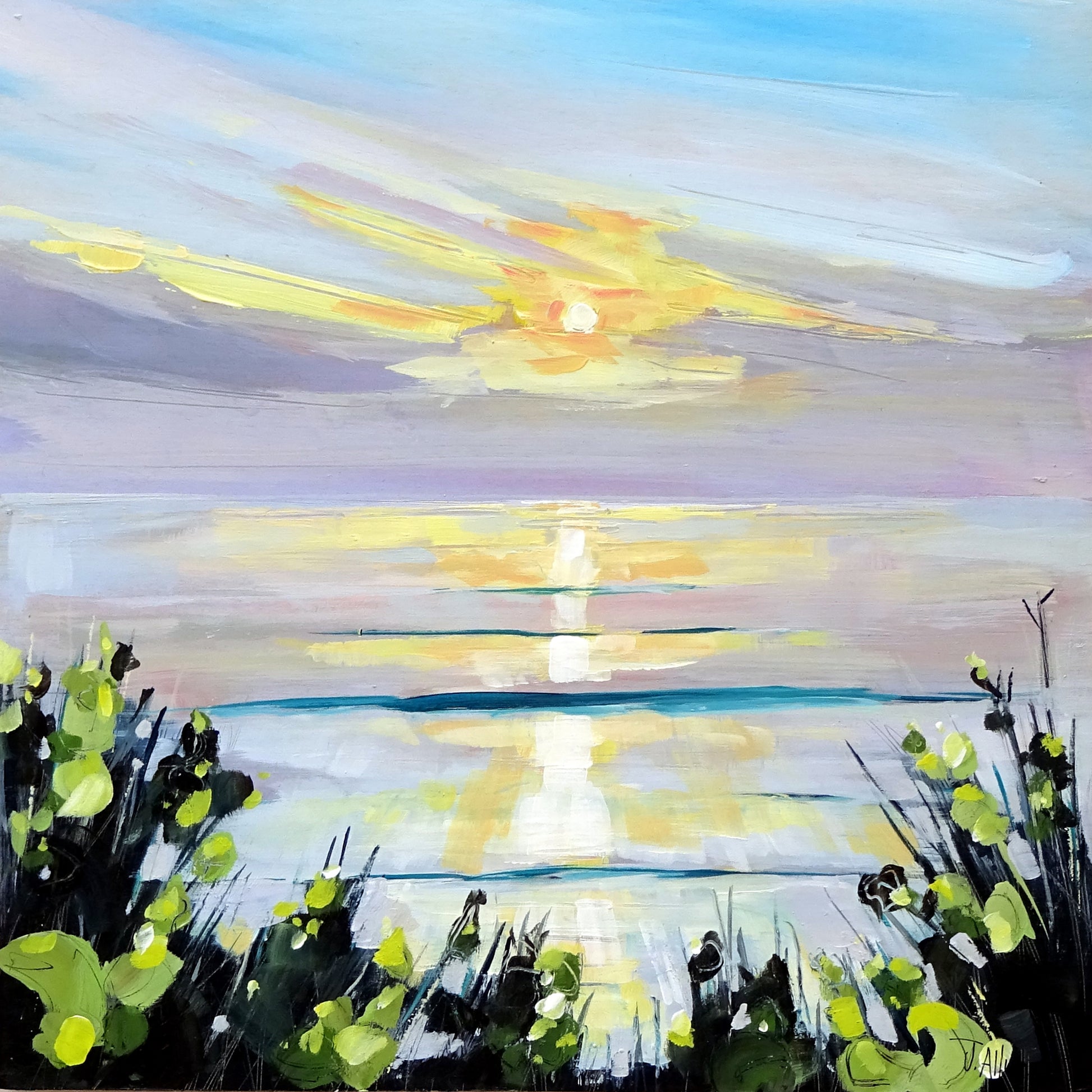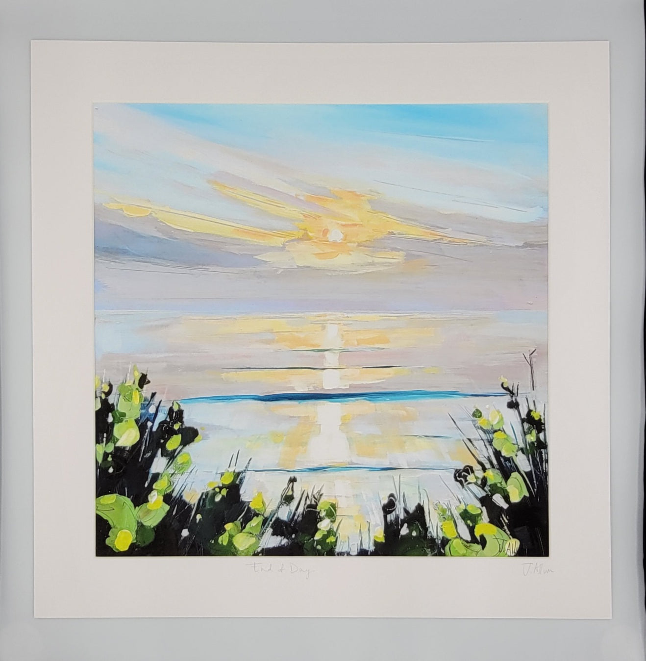 Experience the calming tranquility of a beach sunset with our "End of Day" art print by Jo Allum. The beautiful colors and serene atmosphere will bring a sense of peace and relaxation to any room. Perfect for adding a touch of serenity to your home or office.