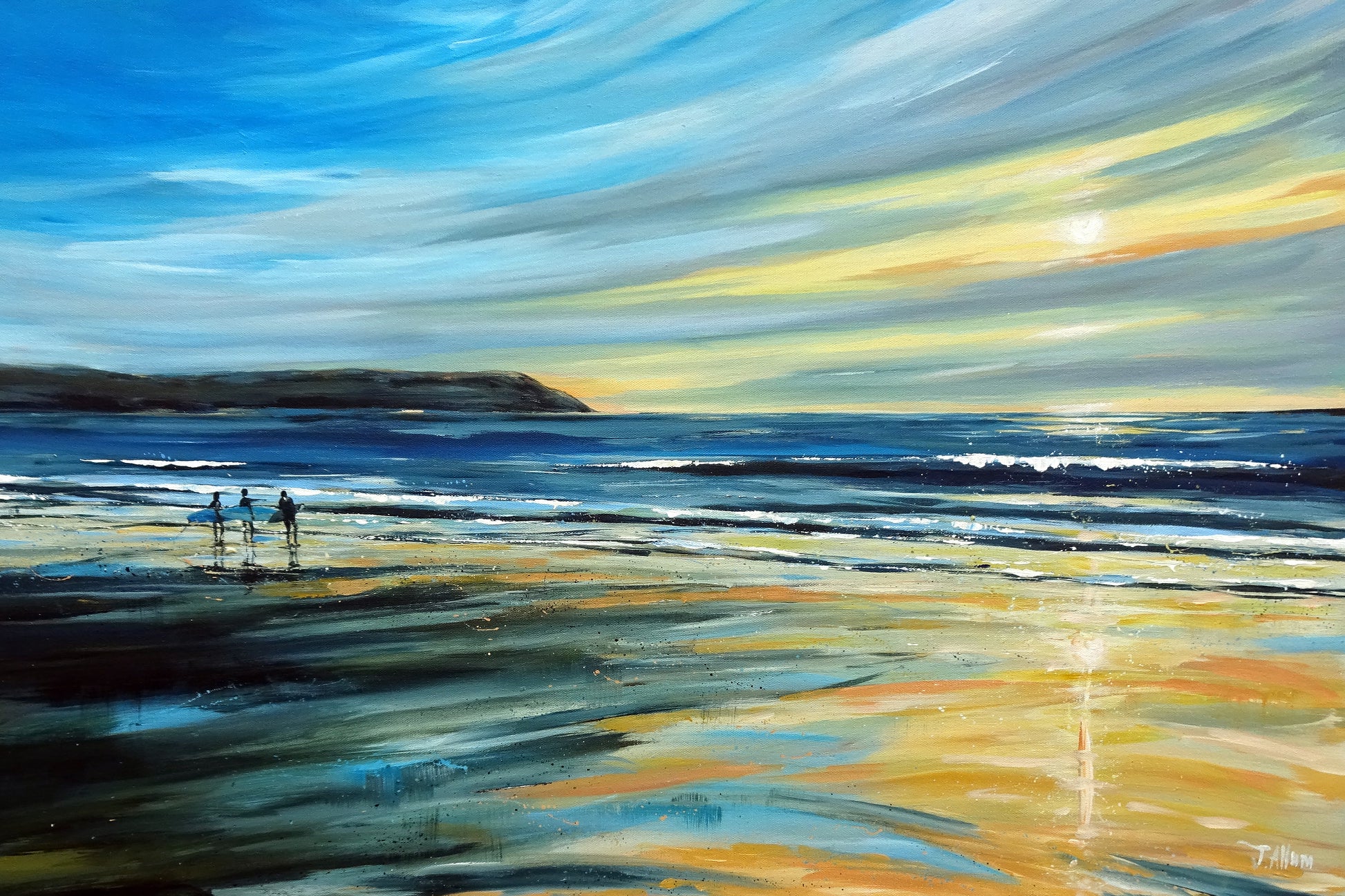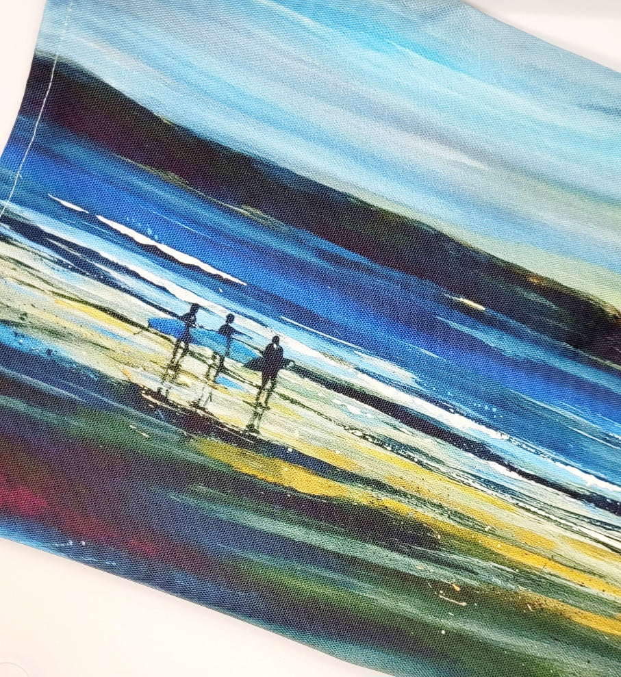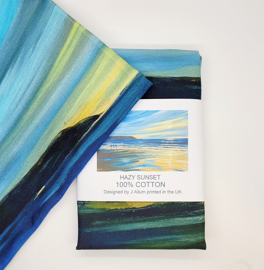 Introducing the Hazy Sunset Tea Towel, crafted from 100% cotton and printed with a stunning view of Woolacombe beach in North Devon. Admire the surfers silhouetted against a sunset backdrop, captured by artist Jo Allum. Elevate your kitchen decor with this functional and beautiful piece.