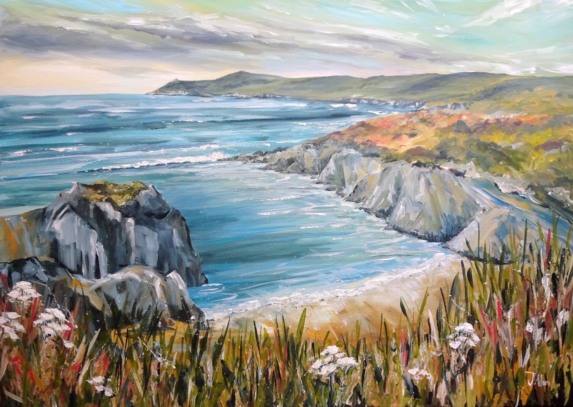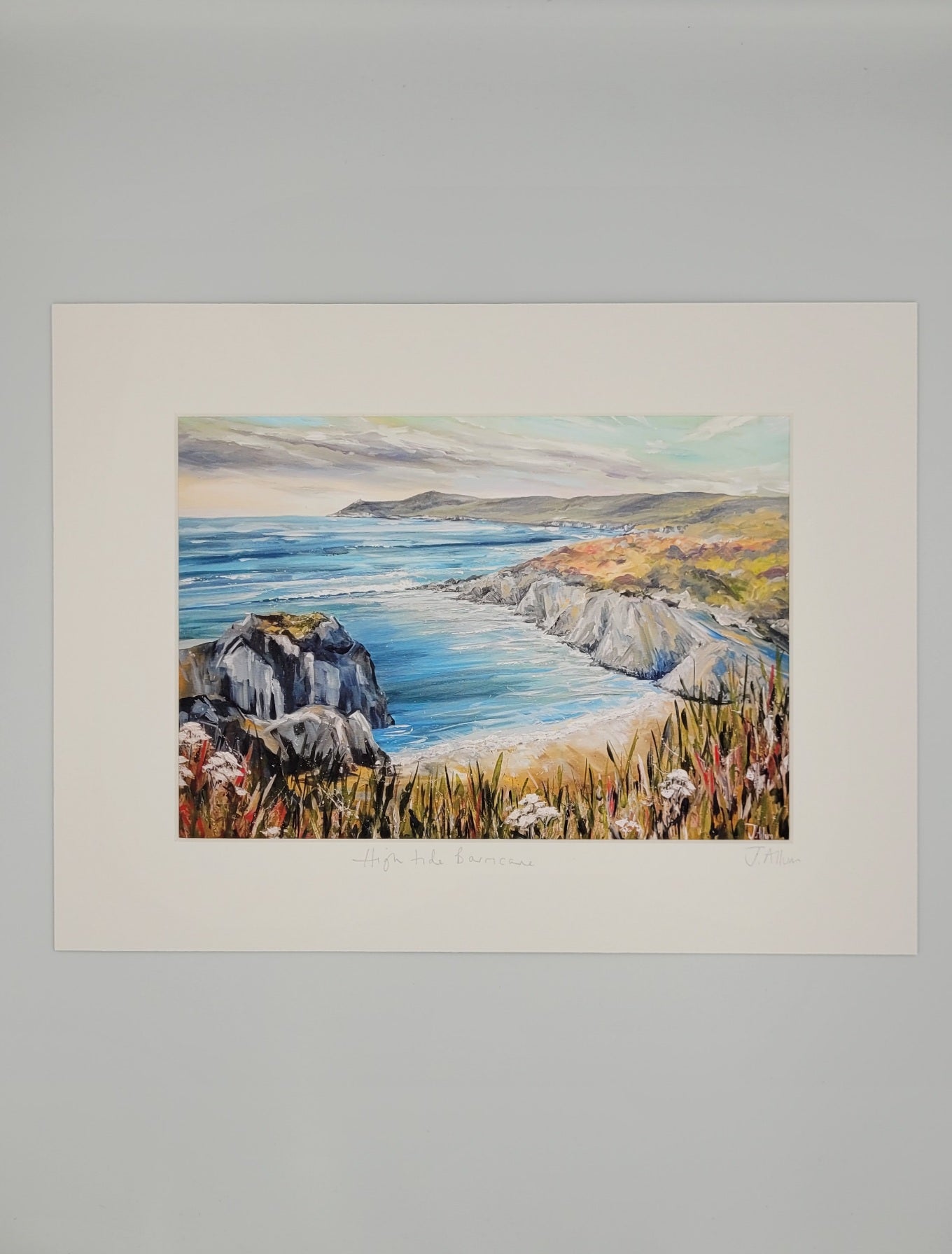 Discover the beauty of Barricane beach with this high-quality art print by Devon artist Jo Allum. With its sheltered cove, sea shells, and stunning sunset views, it's no wonder this beach is a favorite among many.