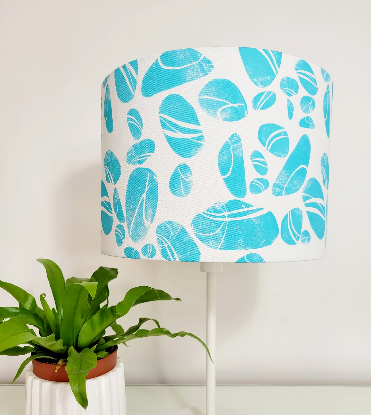 Featuring a stunning turquoise and white pebble design taken from a lino print by Jo Allum, this lampshade is a work of art.