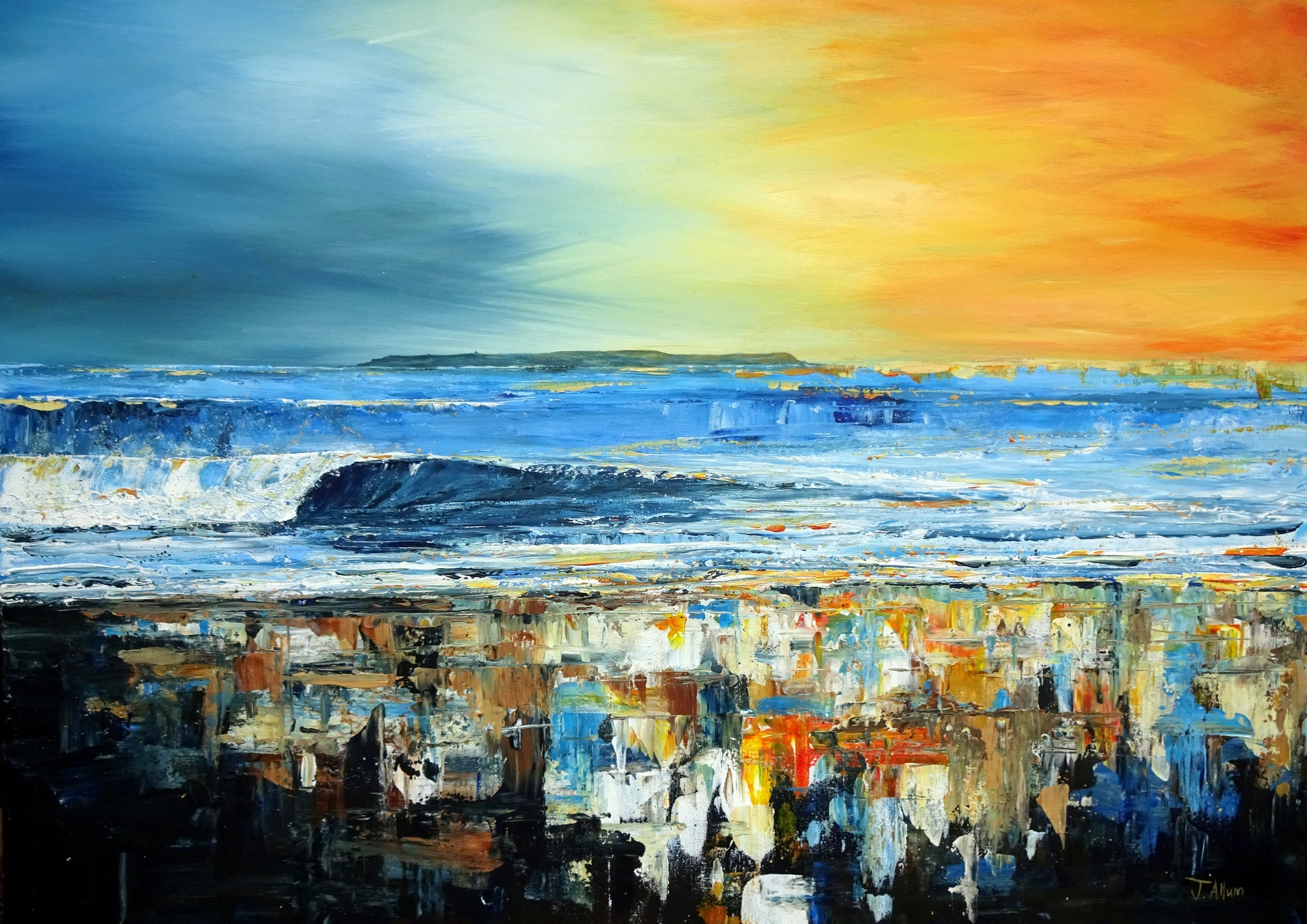 Introducing "Lundy Sunset" art print by Jo Allum. This bright and bold piece features an abstract, textural foreground, providing a stunning view of Lundy Island. Created by Devon artist Jo Allum, this print adds a unique touch to any space.