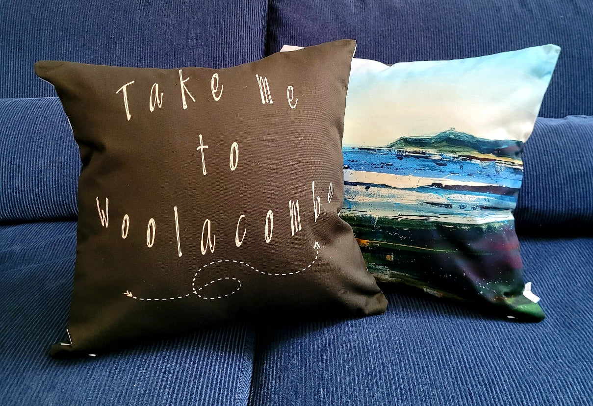 Expertly crafted from 100% cotton, the Morte Blues Cushion boasts a stunning double-sided design. Featuring Jo Allum's Morte Blues print on one side and "Take me to Woolacombe" on a sleek dark grey reverse, this cushion is both stylish and comfortable. Perfect for adding a touch of beachy charm to any room.