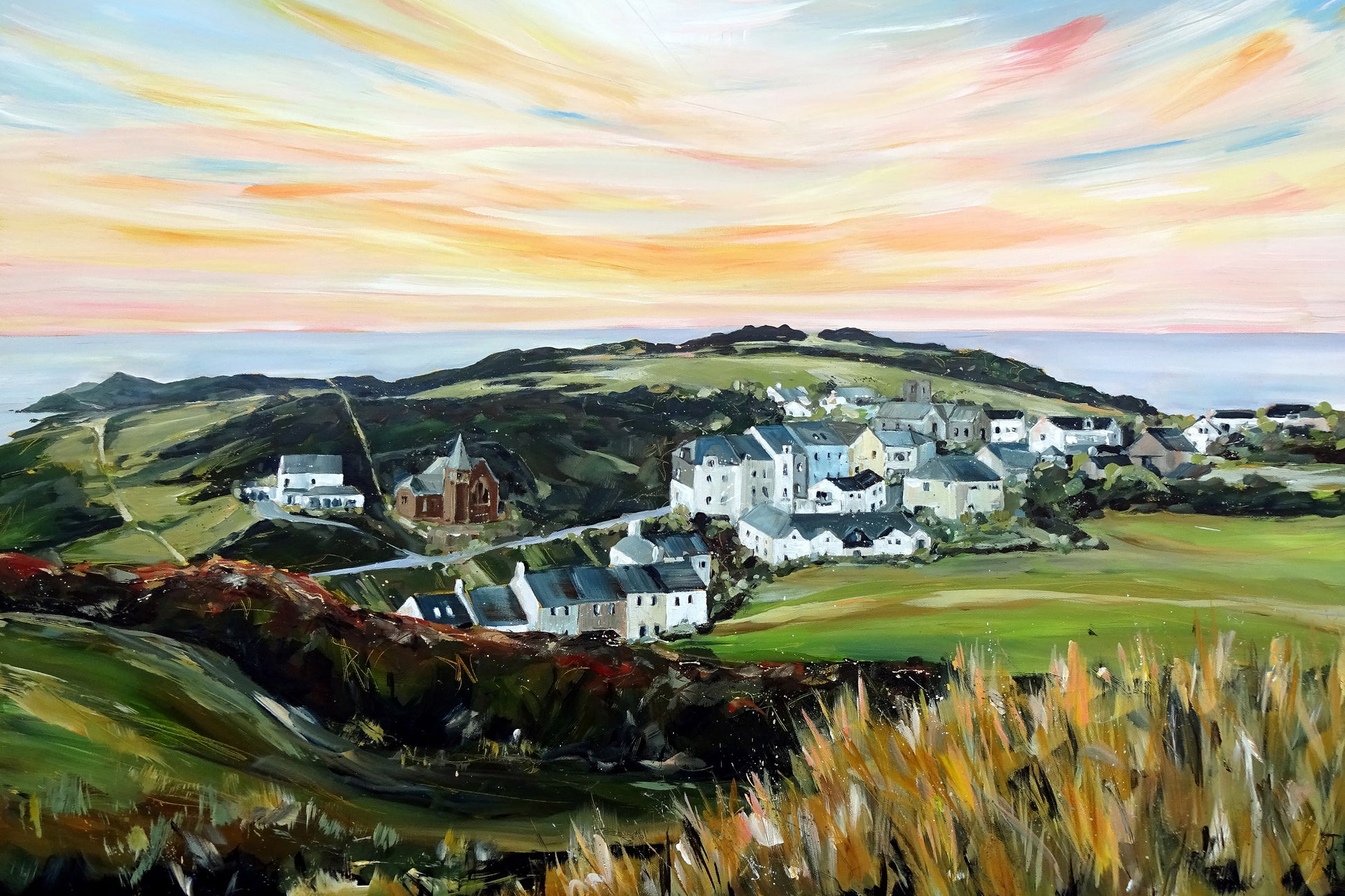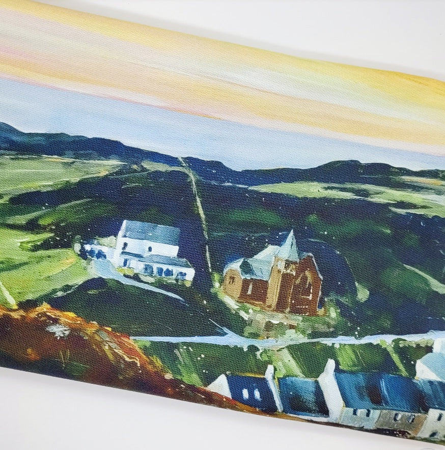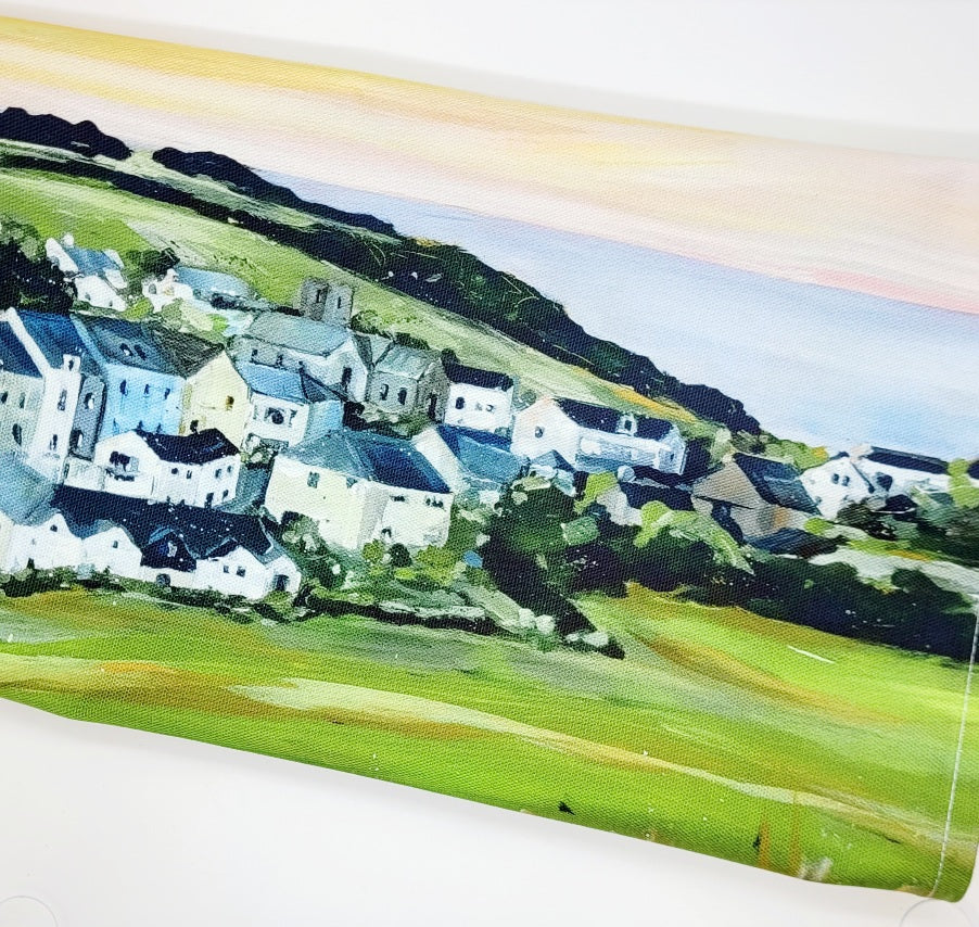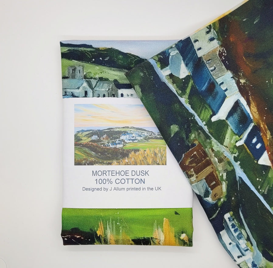 100% Cotton tea towel printed with a view across the pretty village of Mortehoe in North Devon by Jo Allum.