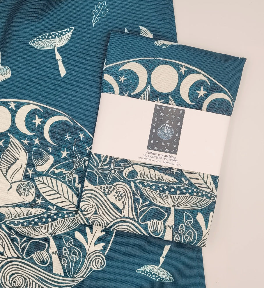 This high-quality tea towel is made of 100% cotton and features a beautiful nature design by Jo Allum.