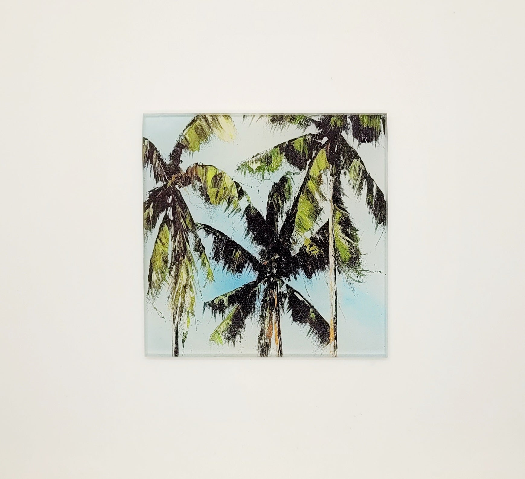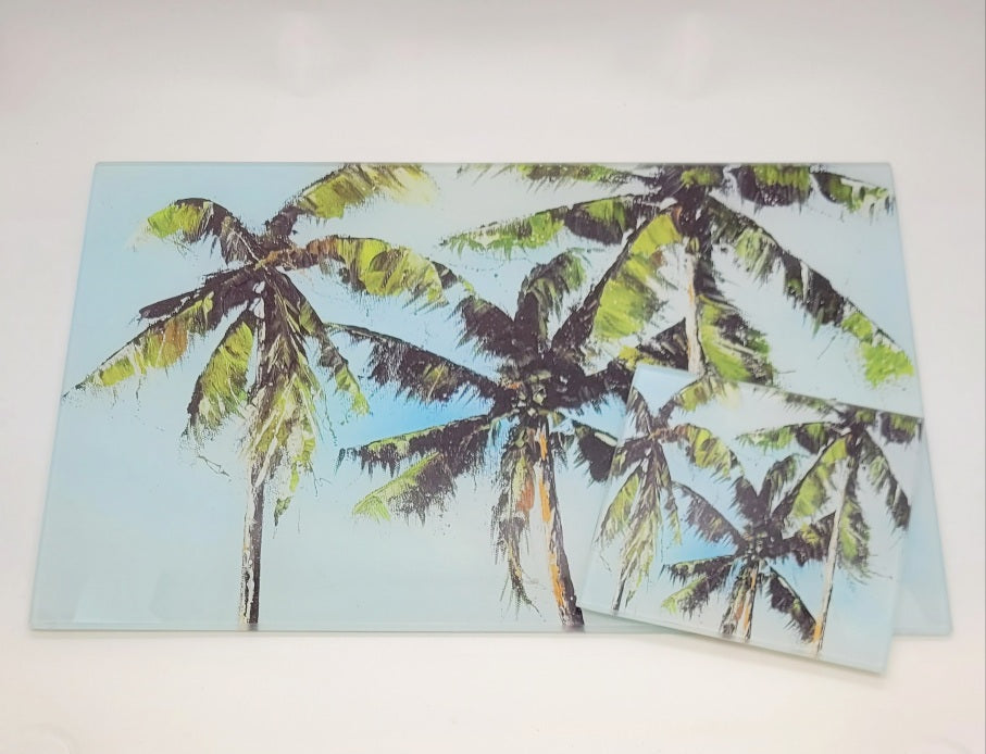 Expertly crafted with toughened glass, my Palm tree worktop savers, table mats or coasters feature the stunning Palms design by Jo Allum.