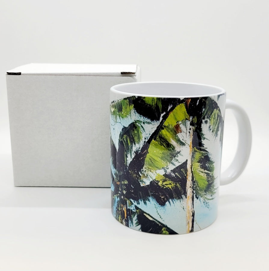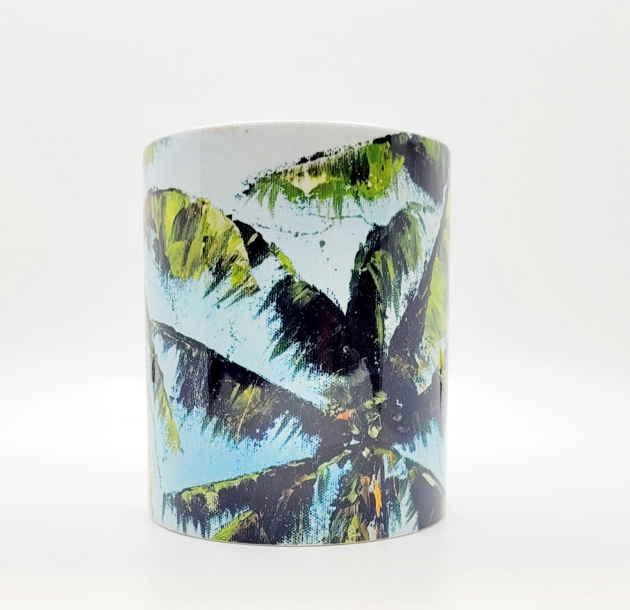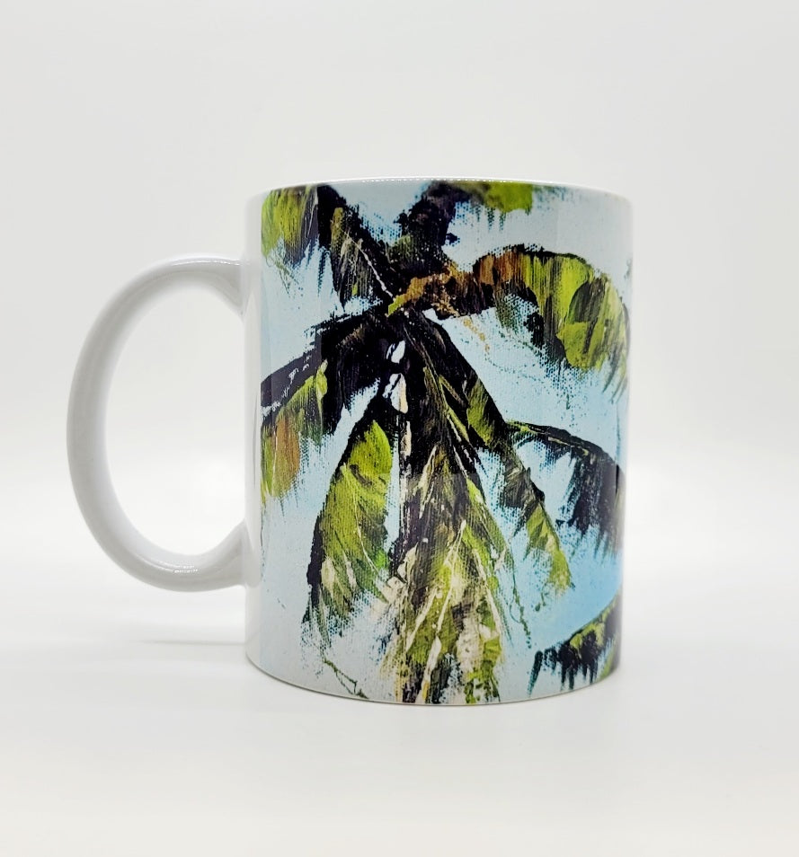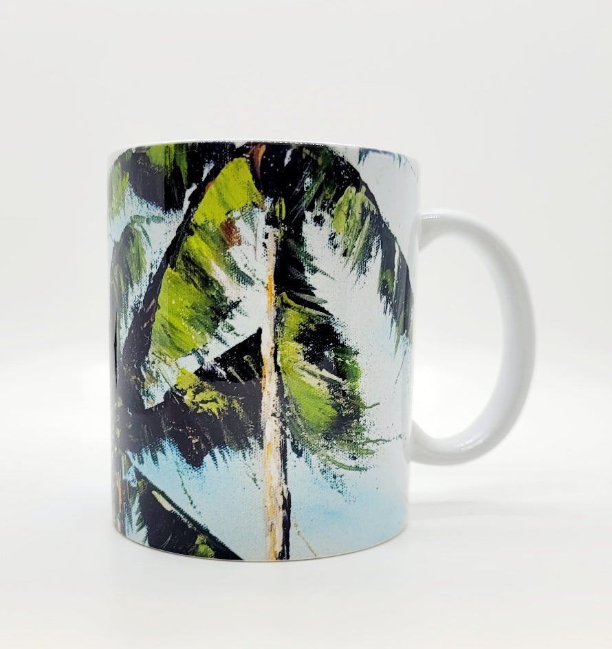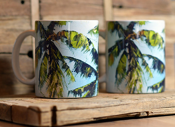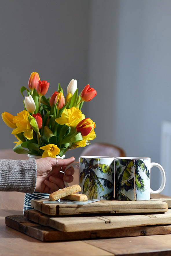 This sleek ceramic mug features a vibrant palm tree design by Devon artist Jo Allum.