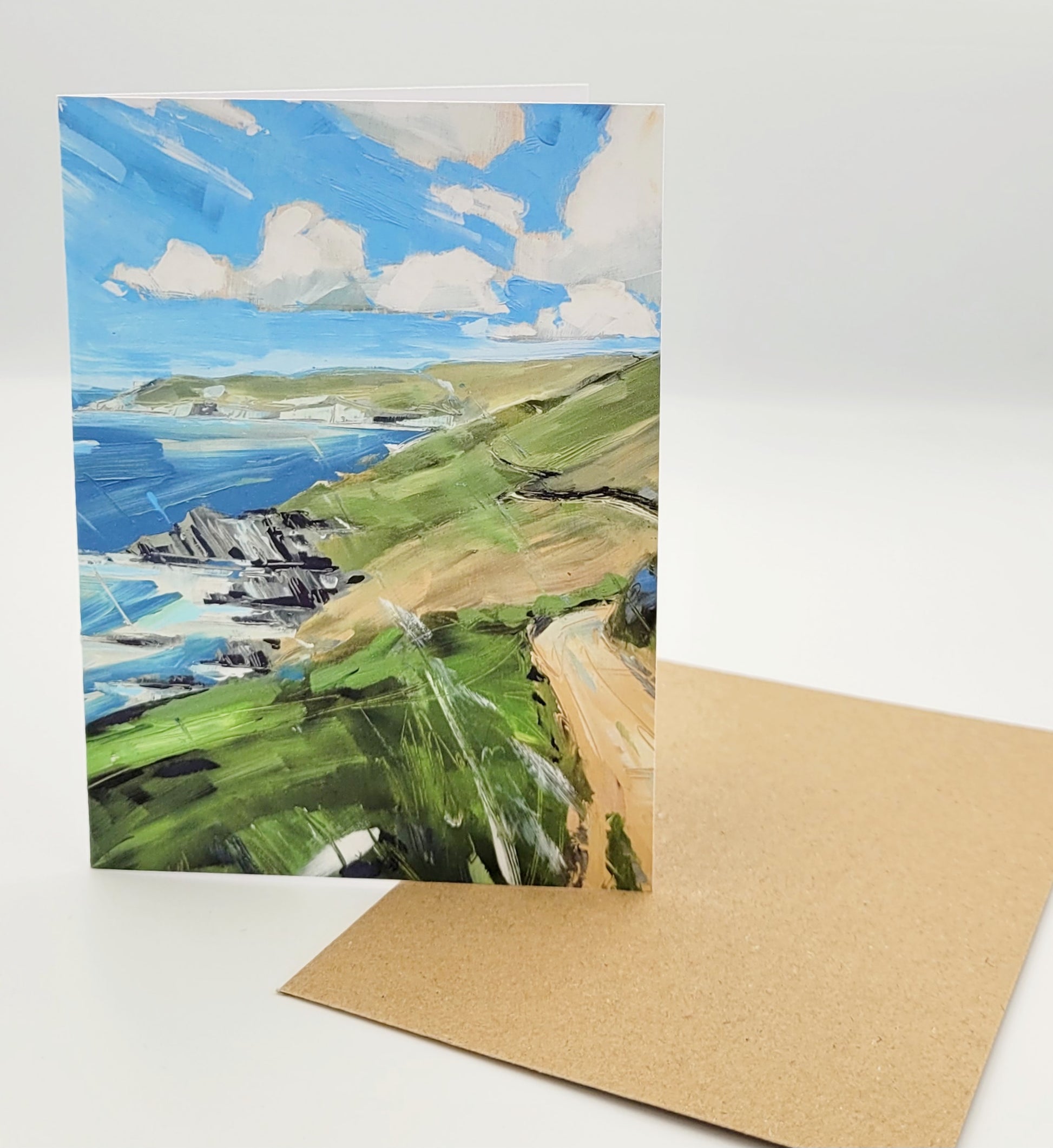 C6 size blank card featuring a section of the south west coastal path at Mortehoe from original artwork by Jo Allum.