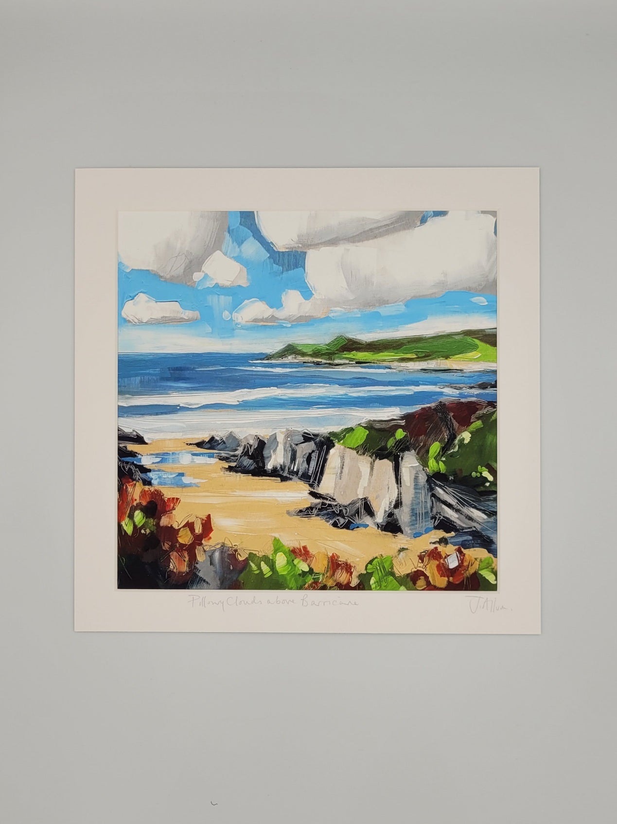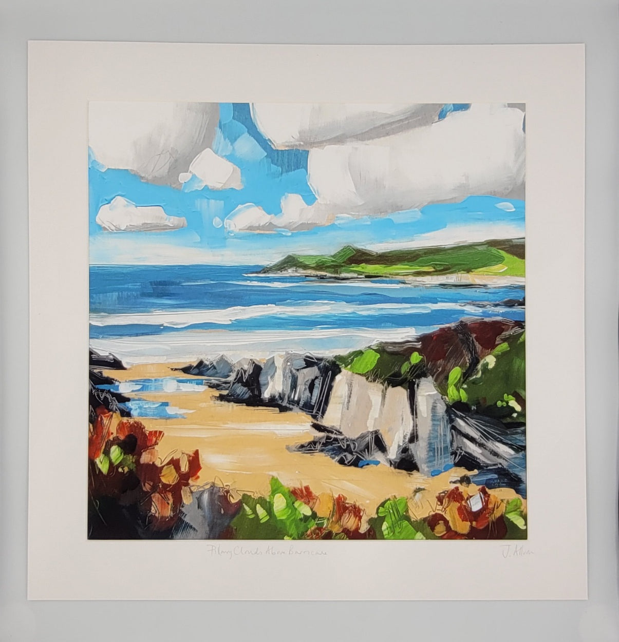 Immerse yourself in the colorful and lively world of Barricane beach with "Pillowy Clouds above Barricane" by Jo Allum.