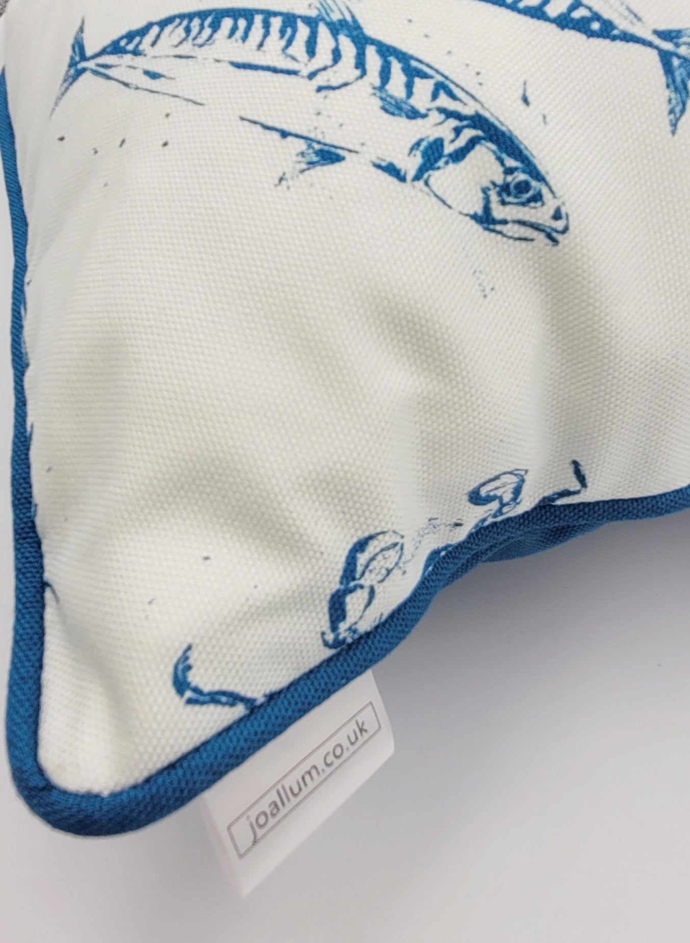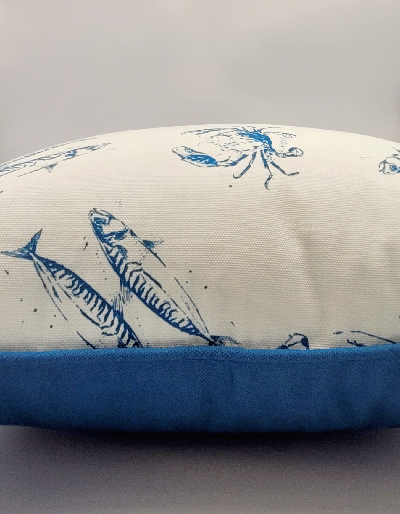 Made with 100% cotton and featuring a classic coastal crab, lobster and Mackerel design by Jo Allum, with a blue reverse and matching piped edge, this cushion is perfect for adding a touch of elegance to any room.