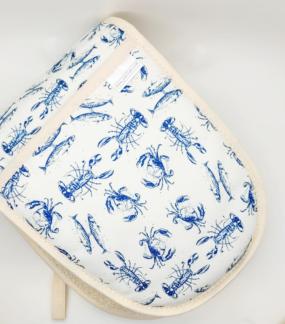 Expertly designed Sealife Oven Gloves featuring a vibrant Lobster, Crab, and Mackerel print by Jo Allum.