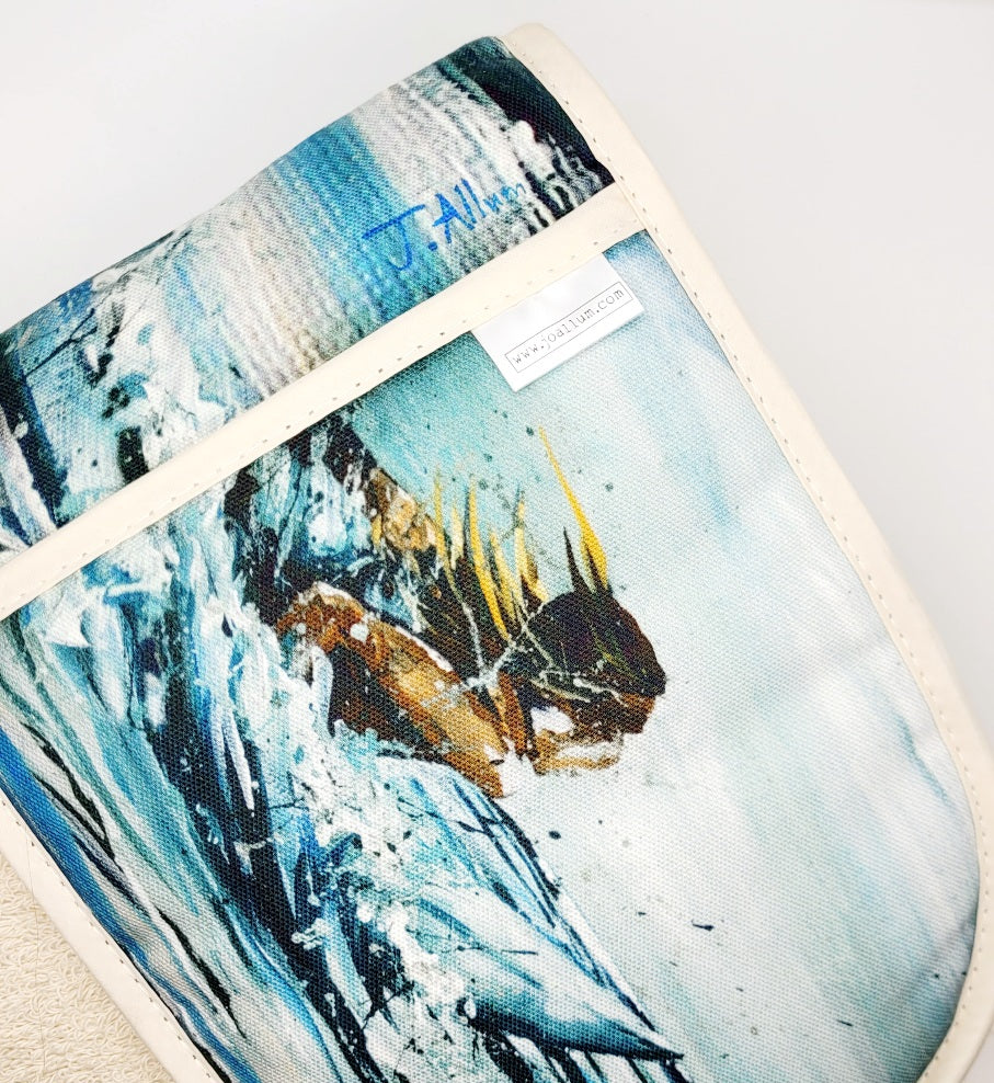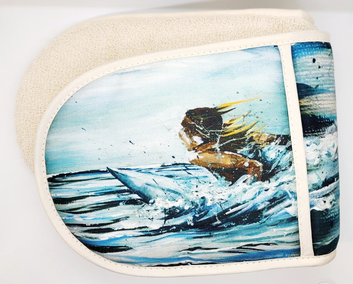 Protect your hands while cooking with the stylish and durable Soul Surfer Oven Gloves. Made with 100% cotton, these gloves feature the unique design by Jo Allum.