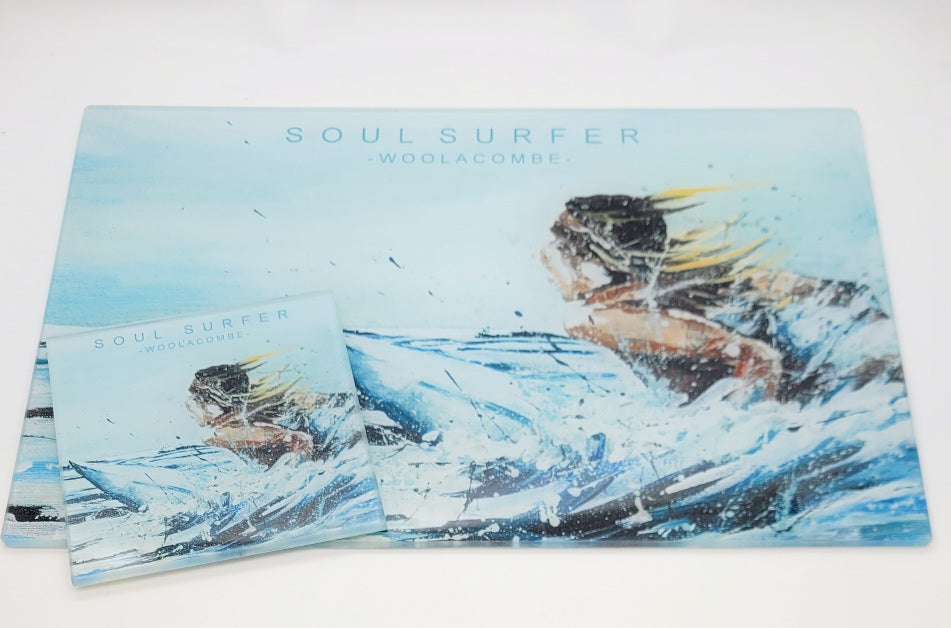 Protect your surfaces with our toughened glass soul surfer worktop savers, table mats, and coasters featuring the stunning design by Jo Allum. Durable and stylish, these essential items will add a touch of personality to your home while keeping your surfaces safe.