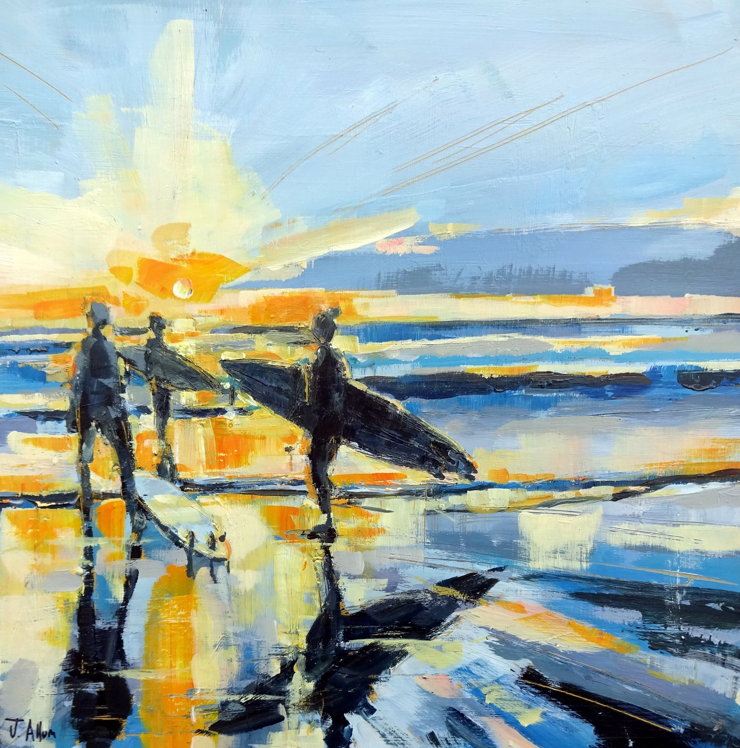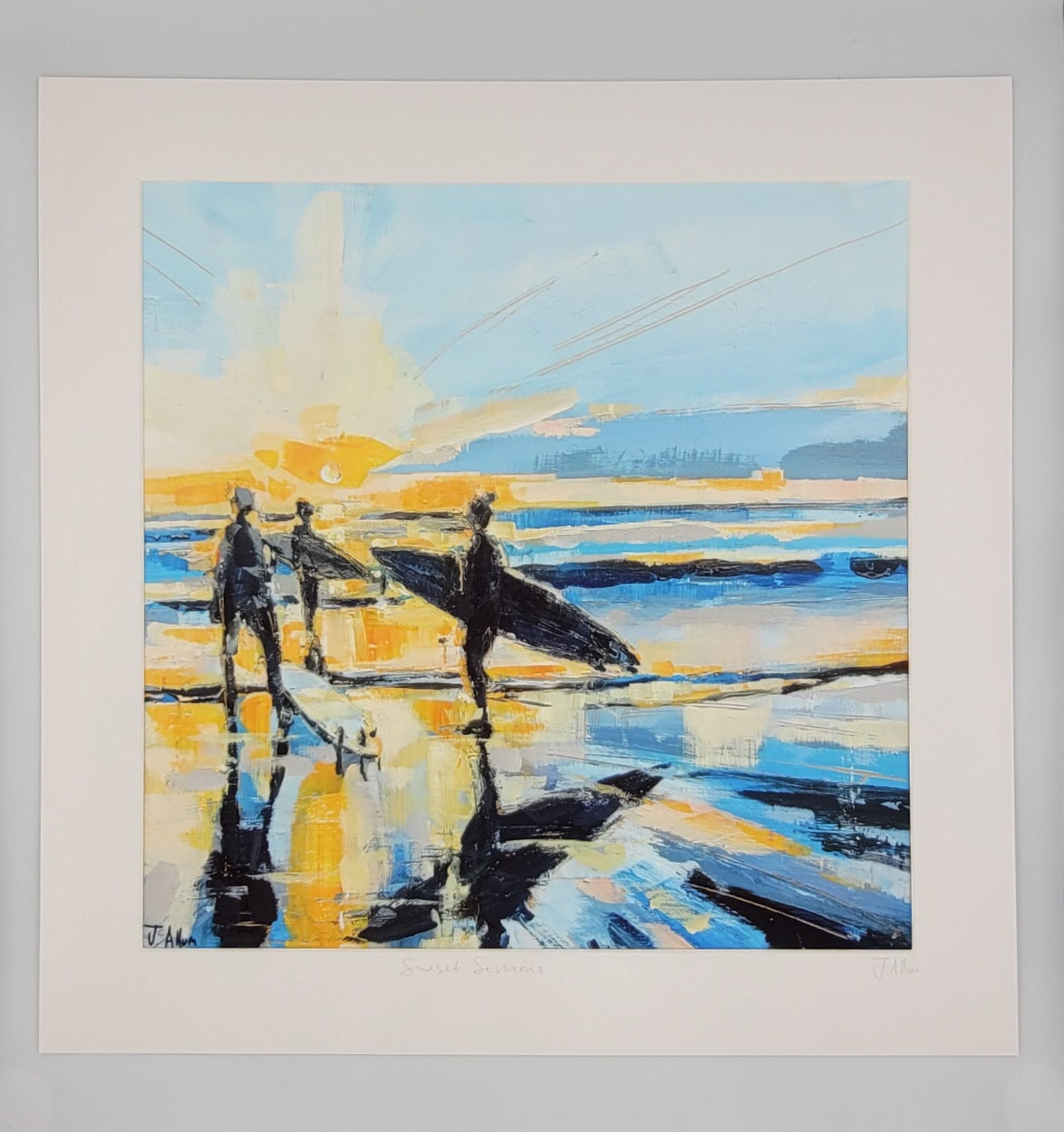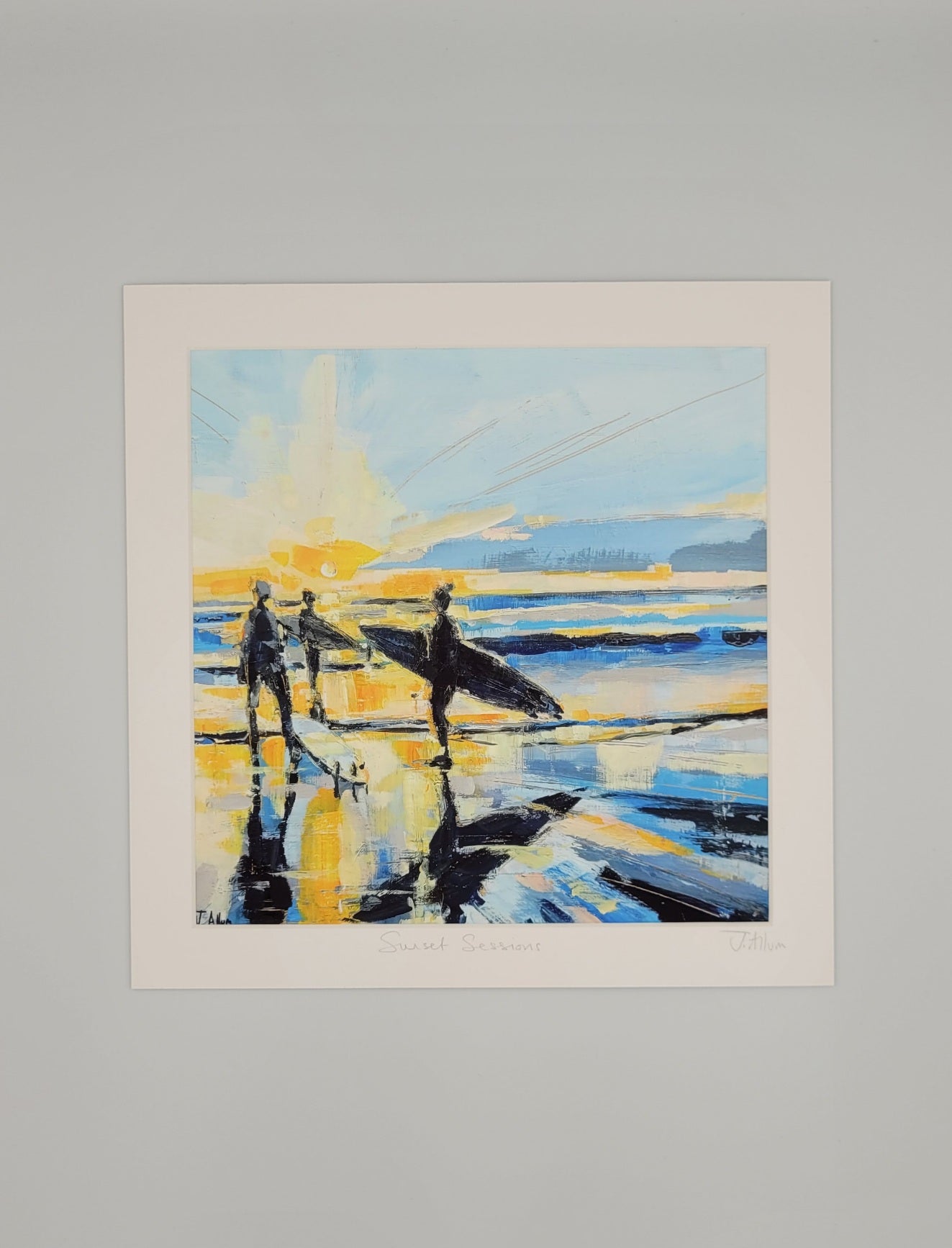 Enjoy the beauty of a sunset surf with Jo Allum's "Sunset Sessions" art print.