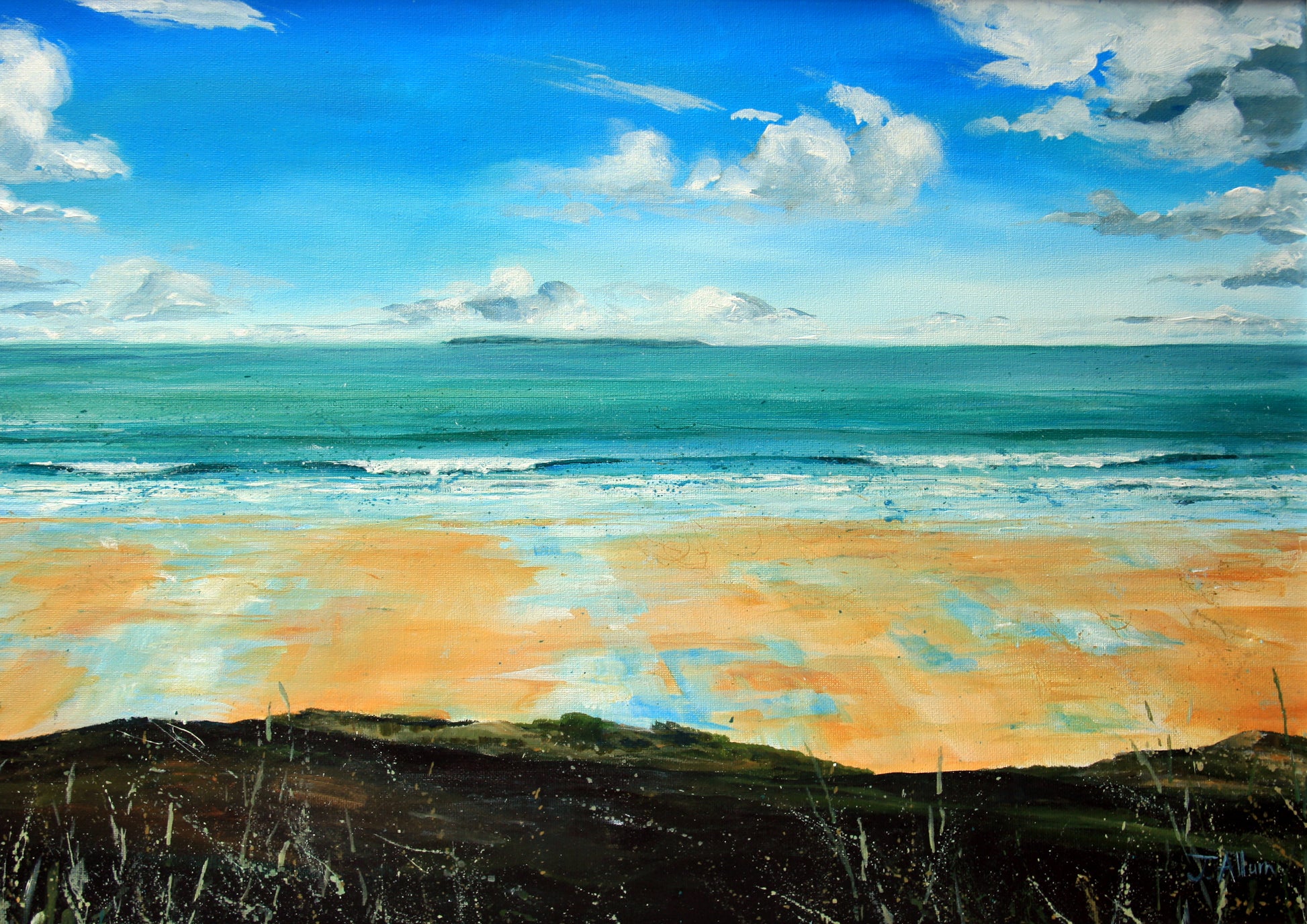 This art print captures the scenic view from the sand dunes in Woolacombe, overlooking the beach and out to sea towards Lundy Island. Created by Devon artist Jo Allum, it brings the natural beauty of the area to life. Add a touch of coastal charm to your home décor with this stunning piece.