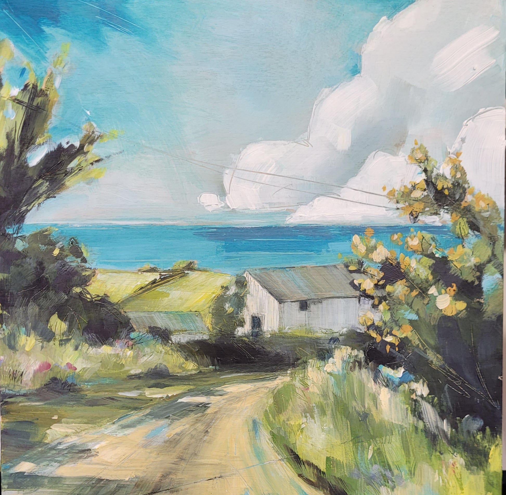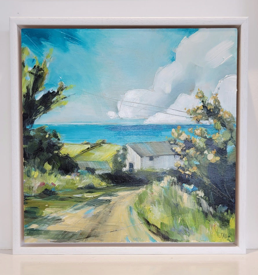 Experience the beauty of Devon with this original painting by Jo Allum. Delight in the vibrant colors of the spring and summer lanes, and be captivated as you turn each corner and catch glimpses of the sea. This piece is painted on cradled wood, creating a unique and charming addition to any art collection.