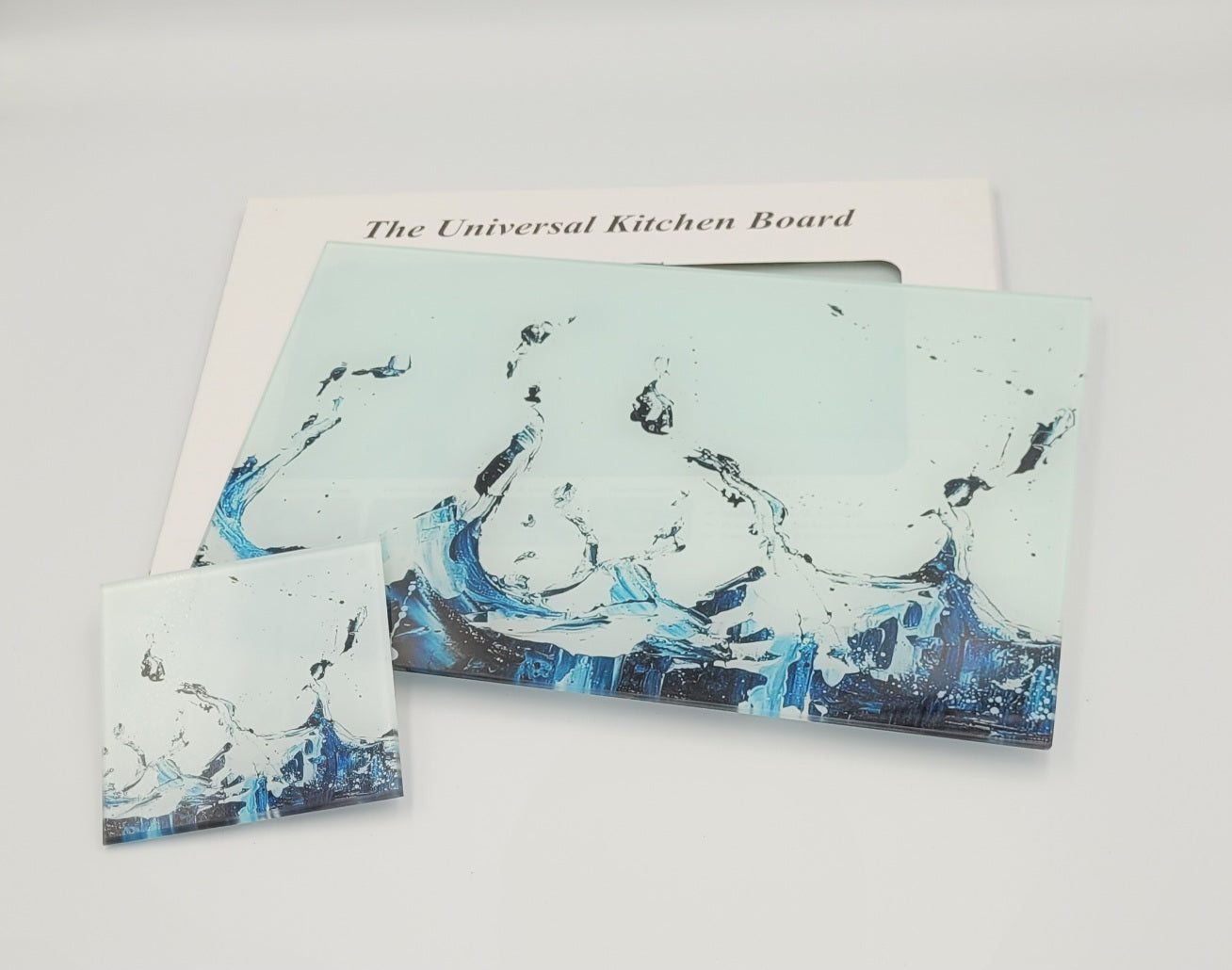 Protect your worktops and tables in style with our Water design worktop savers, table mats and coasters. Made from toughened glass and featuring the striking water splash design by Jo Allum, these accessories are not only functional but also add a touch of personality to your kitchenware.