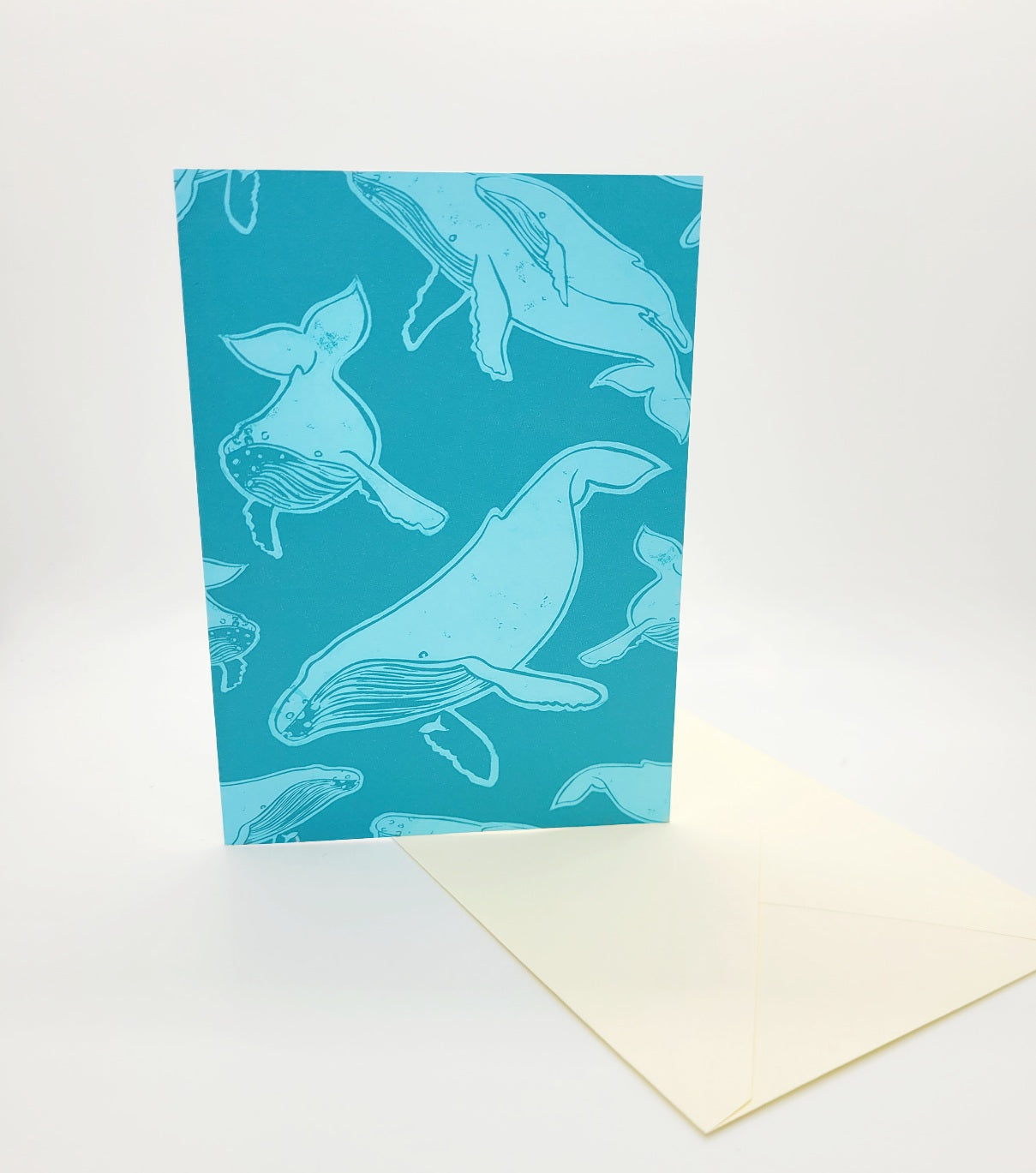 C6 size blank card and envelope with whale design taken from an original lino print by Jo Allum