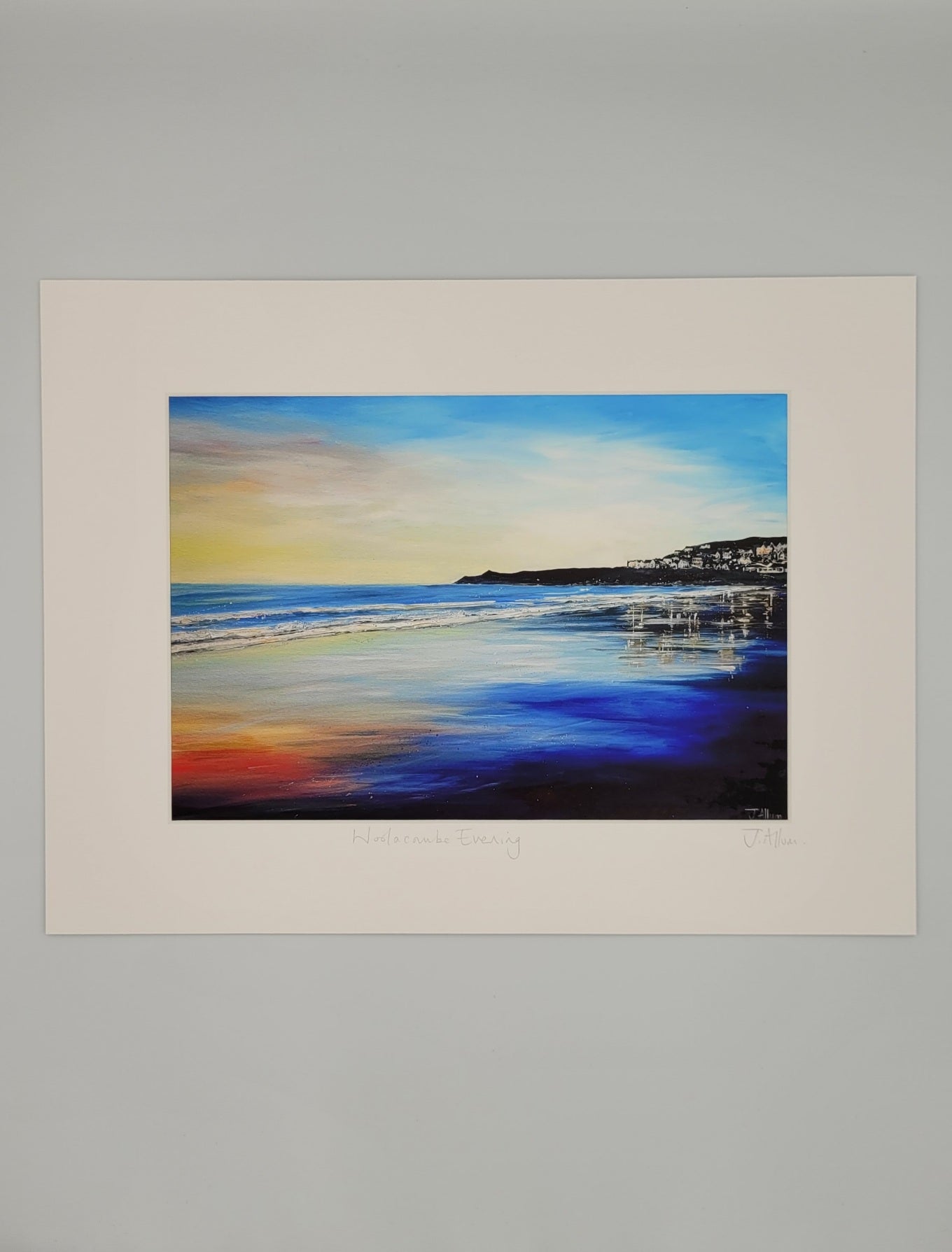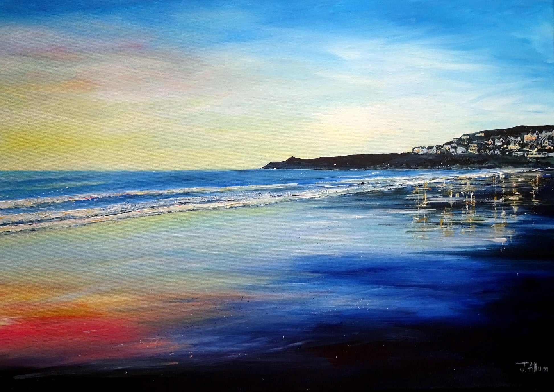 The pretty seaside town of Woolacombe at sunset when the lights reflect in the wet sand. Taken from an original painting by Devon artist Jo Allum.